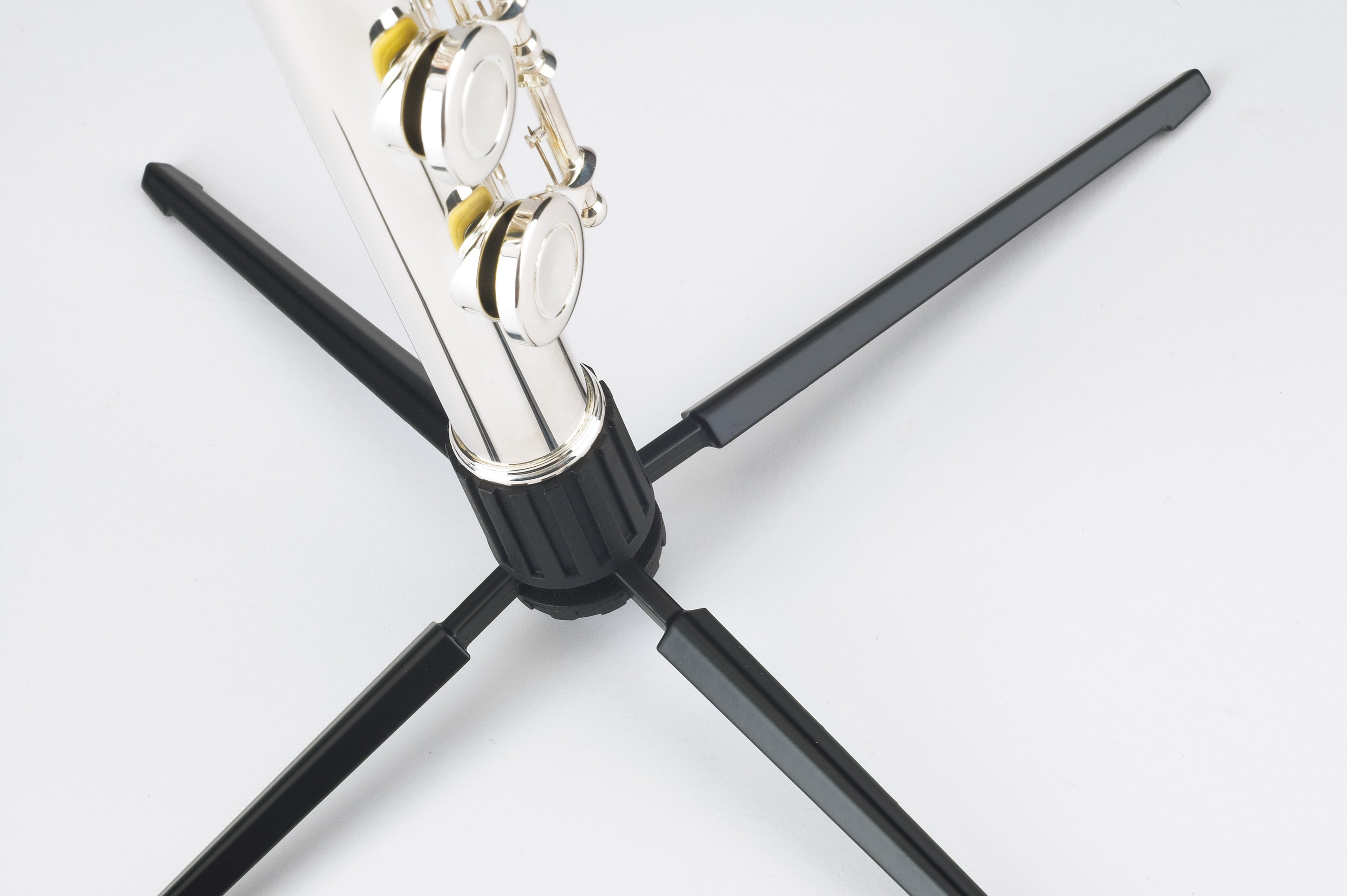 Unique, compact and extremely light flute stand with 4-leg base for Böhm flutes and/or cross flutes. Plastic peg diameter 18 mm. The zinc die-cast legs ensure a very high stability. Folded up the stand fits in almost every pocket.
