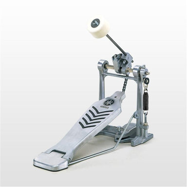 The DFP-9500D is a direct drive double pedal, with a solid cast link between the rocker shaft and the footboards. The direct drive "pushes" the footboards back on rebound, giving the pedal a quicker response. Many drummers that play heel-down prefer the feel of a direct drive. The DFP-9500D has adjustments for beater angle, footboard angle, and spring tension. The pedal frames have stabilizer bars cast into them below the rocker shafts to eliminate flex. This keeps the bearings in alignment and gives the pedal a smooth feel. The hole in the beater hubs are tear drop shaped so it securely holds the beater shafts and keeps the new two-sided beaters from spinning. The new beater is felt on one side, and hard plastic on the other. The side-adjustable hoop clamp holds firmly to different thickness hoops, and tightens with a wing bolt. The DFP-9500D ships in a hard sided soft case to keep the universal joints, beaters, and pedals together for transport.