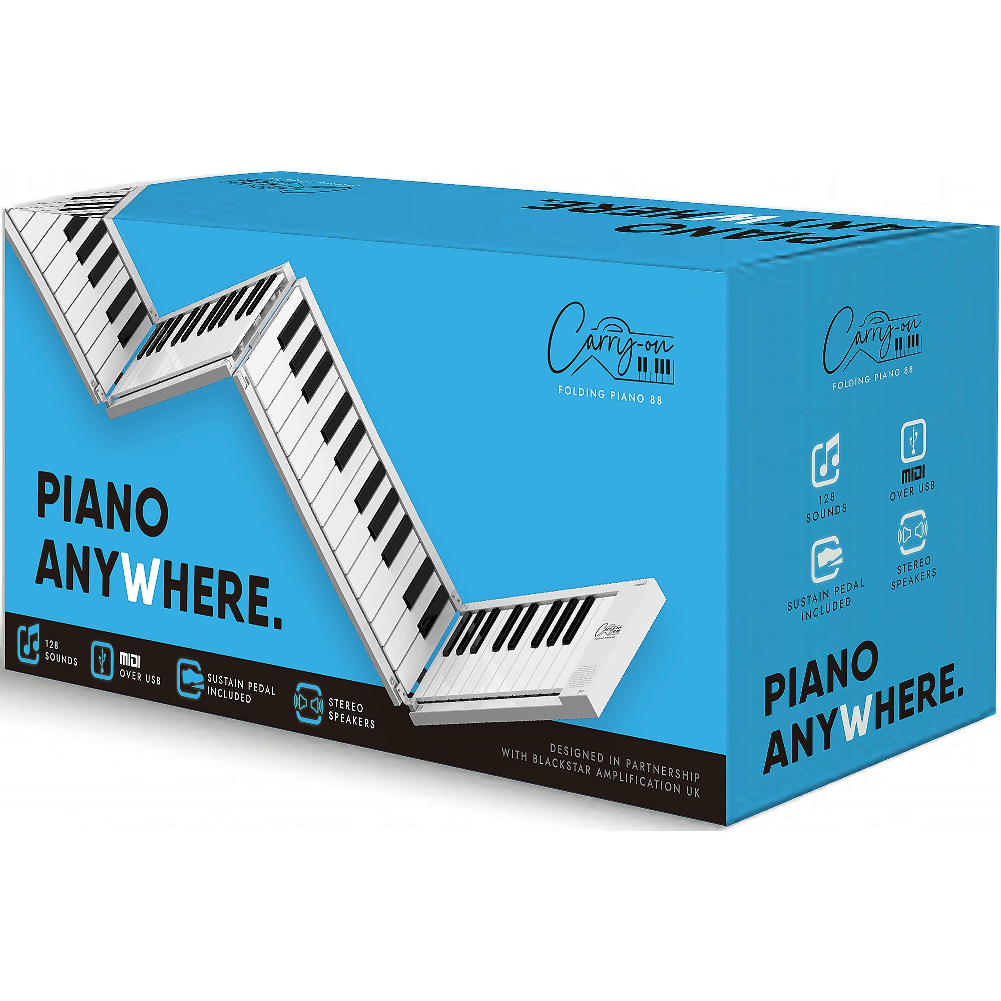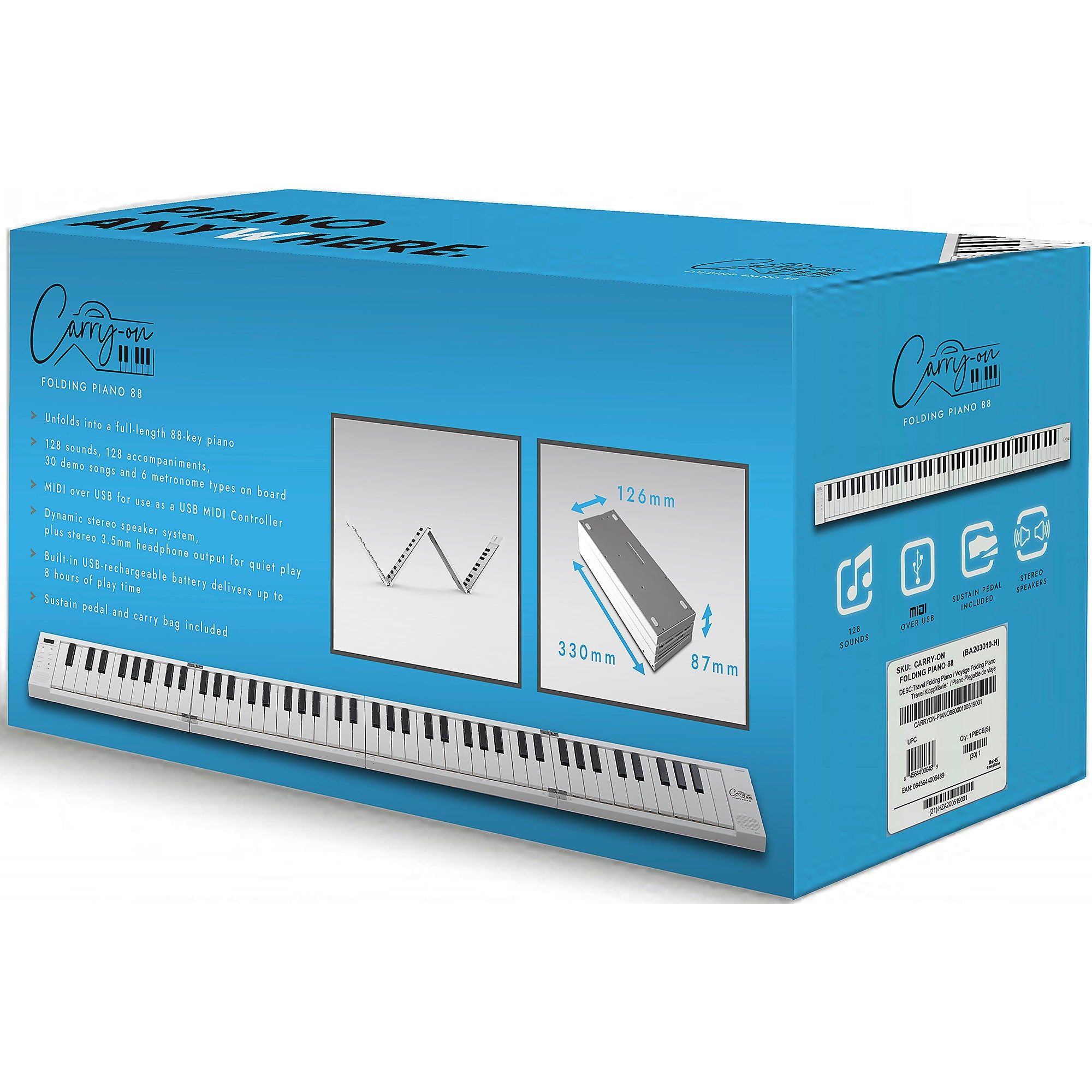 Carry-on最新推出獨一無二的摺疊式88鍵數碼鍵琴,重量僅為1.6公斤,折疊後僅長33厘米。可折疊的設計,方便收藏和便攜外出。巧妙的設計,為初學者帶來便利,隨時可以利用耳機或內置立體聲揚聲器來進行彈奏。配備128種音色、伴奏,以及USB MIDI連接,Carry-on 摺疊鍵琴是終極便攜的鍵琴練習和錄音系統。