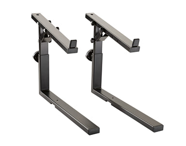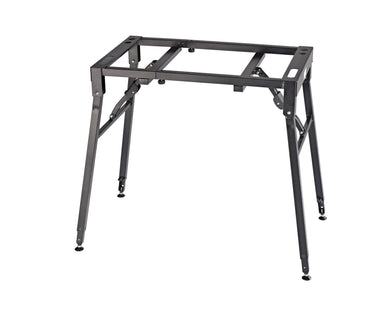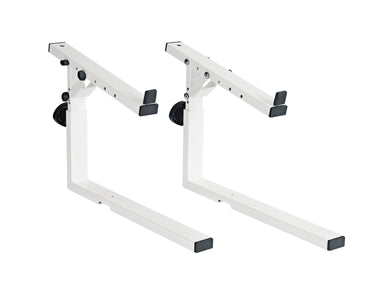 Its compact steel tubing construction and large round levelling end caps make this attractive keyboard stand significantly more stable. Two-sided spring-loaded locking screws make precision height adjustment easy. The support arms can be adjusted to suit the size of the keyboard. When folded, the table is impressively flat. The design of this table matches the piano benches 14080, 14081, 14085, 14086 and 14087. An optional extra are the stackers 18811 for a second level and 18822 for a third level, allowing the use of a second or third keyboard/laptop. Use the adapter 18814 to mount the universal holder 18817 easily and quickly.