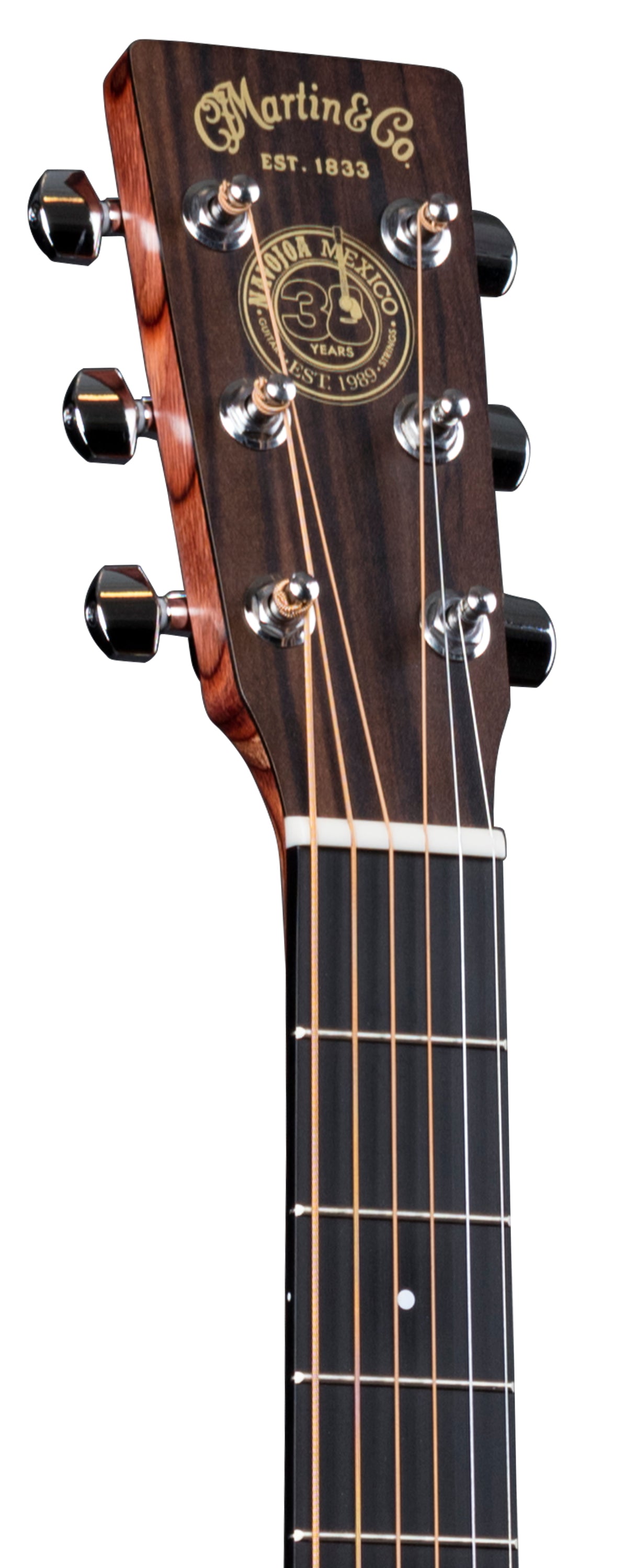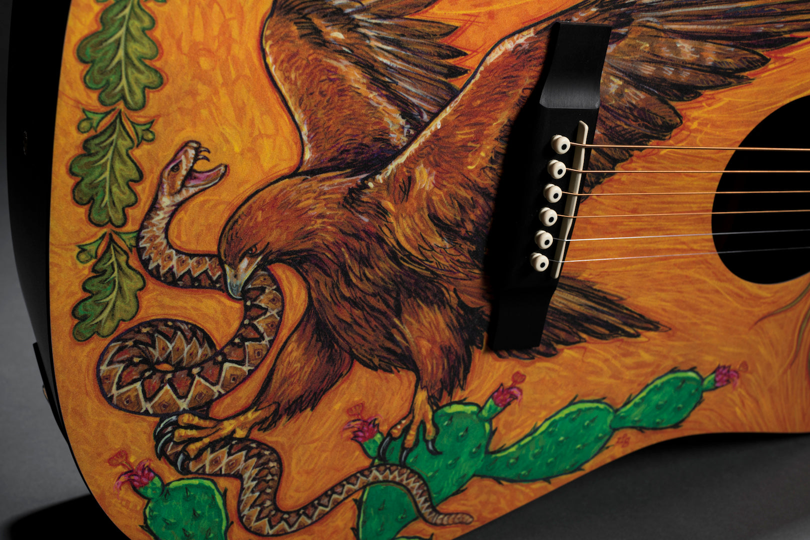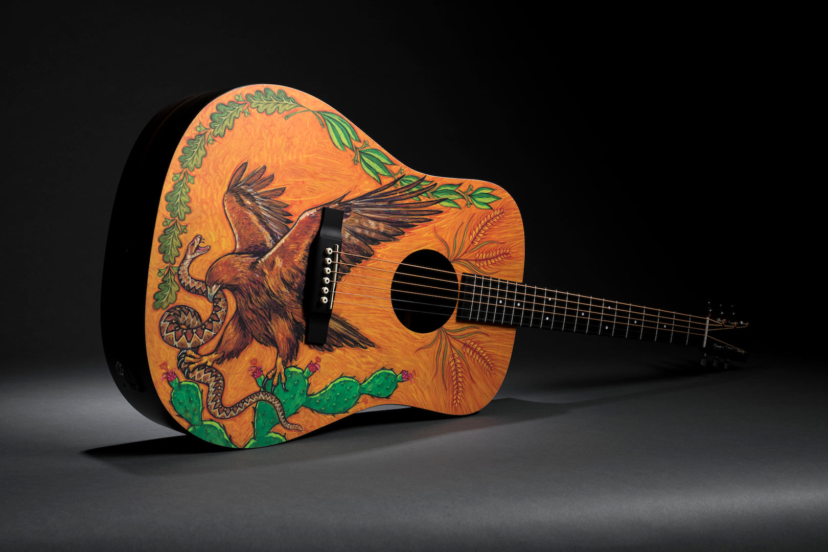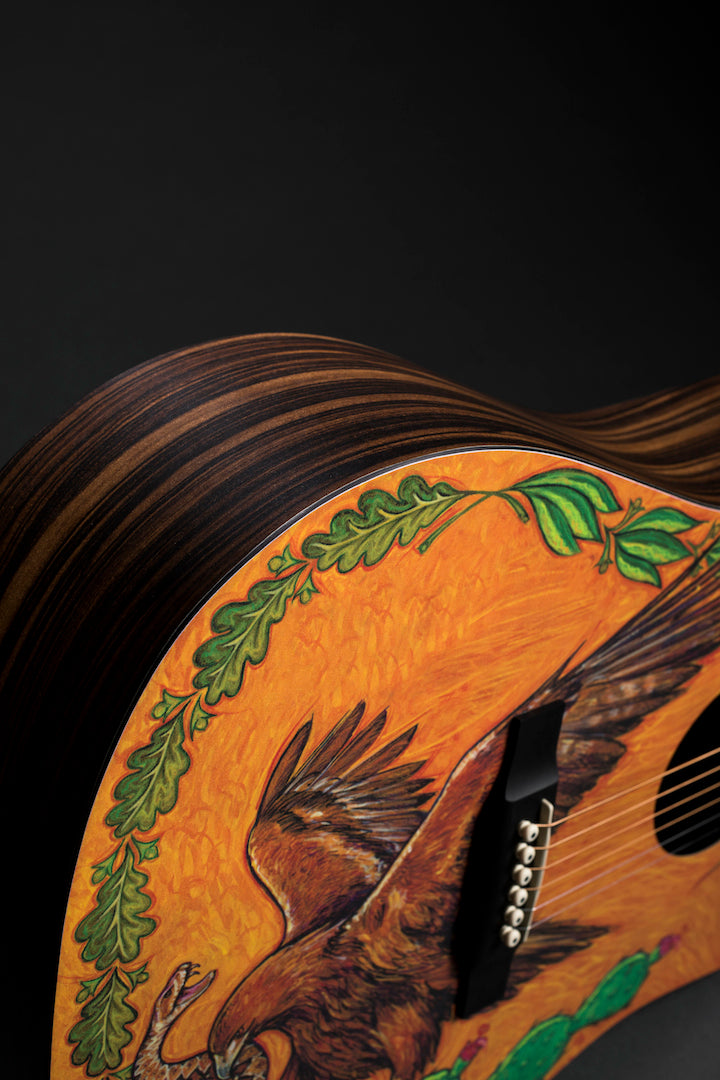 The year 2019 represents a milestone in the history of our Navojoa, Sonora, Mexico, manufacturing plant – 30 years of operation. In that time, Martin colleagues in Mexico have produced world-class guitars and strings, and helped put affordable, high-quality instruments in the hands of countless musicians. Custom artwork from Robert F. Goetzl honors these employees and features elements of Mexican national symbols on this custom HPL Dreadnought. The model also includes Macassar-patterned HPL back and sides, laminated birch neck, and an FSC® certified Richlite® fingerboard and bridge. This model is strung with Authentic Acoustic Lifespan 2.0 strings.