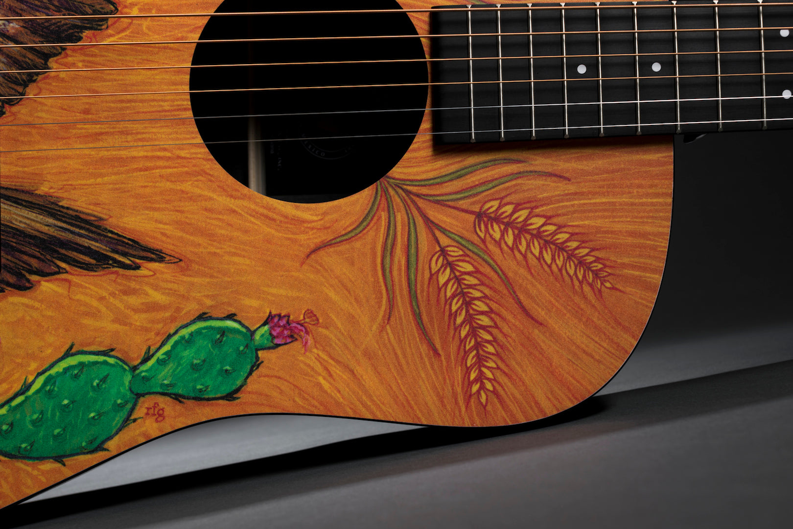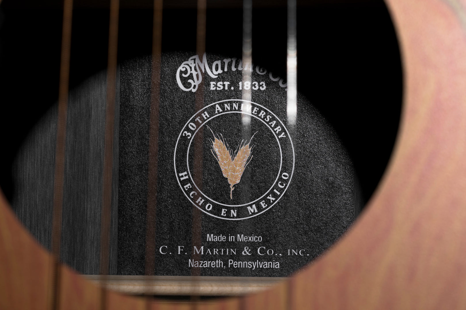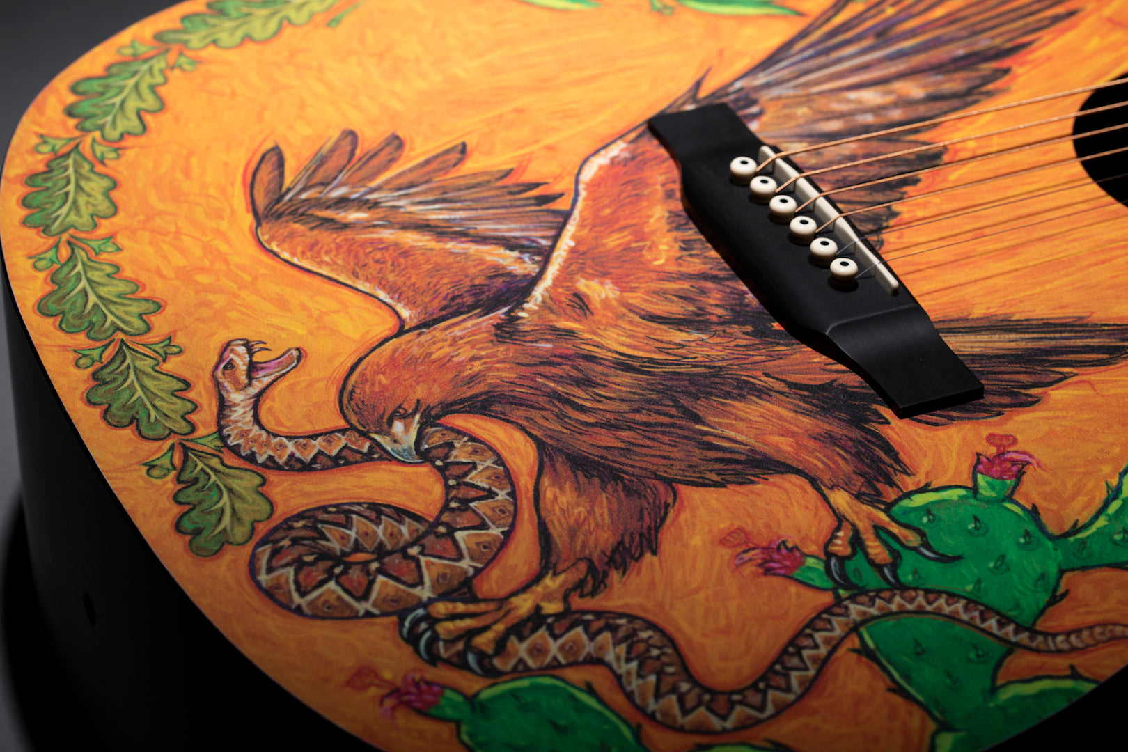 The year 2019 represents a milestone in the history of our Navojoa, Sonora, Mexico, manufacturing plant – 30 years of operation. In that time, Martin colleagues in Mexico have produced world-class guitars and strings, and helped put affordable, high-quality instruments in the hands of countless musicians. Custom artwork from Robert F. Goetzl honors these employees and features elements of Mexican national symbols on this custom HPL Dreadnought. The model also includes Macassar-patterned HPL back and sides, laminated birch neck, and an FSC® certified Richlite® fingerboard and bridge. This model is strung with Authentic Acoustic Lifespan 2.0 strings.
