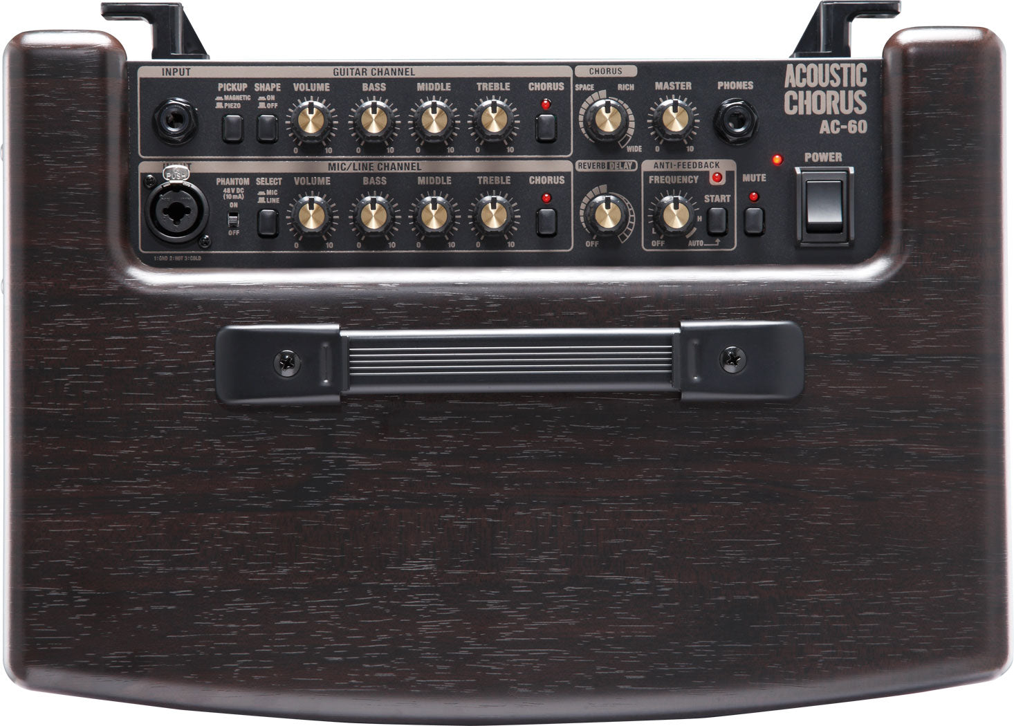 Now the AC-60 is available with beautiful rosewood-look cabinets, offering an alternative to the standard stage-ready black finish. The attractive woodgrain styling perfectly matches the atmosphere of your living room or studio, as well as the aesthetic of your acoustic guitars.