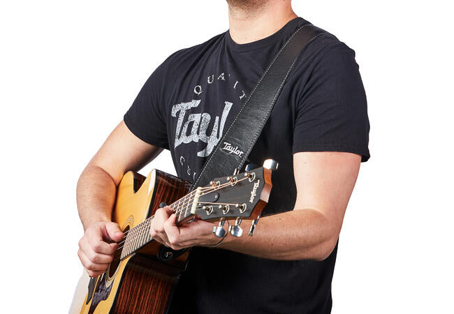 The Taylor Leather Guitar Strap features genuine black leather with beautiful contrast stitching and suede backing. At 2.5" wide, it provides the perfect balance of comfort and support. Finished off with an embossed Taylor logo, this is as classic as leather straps come. Made in the USA. Taylor Model #4102-25