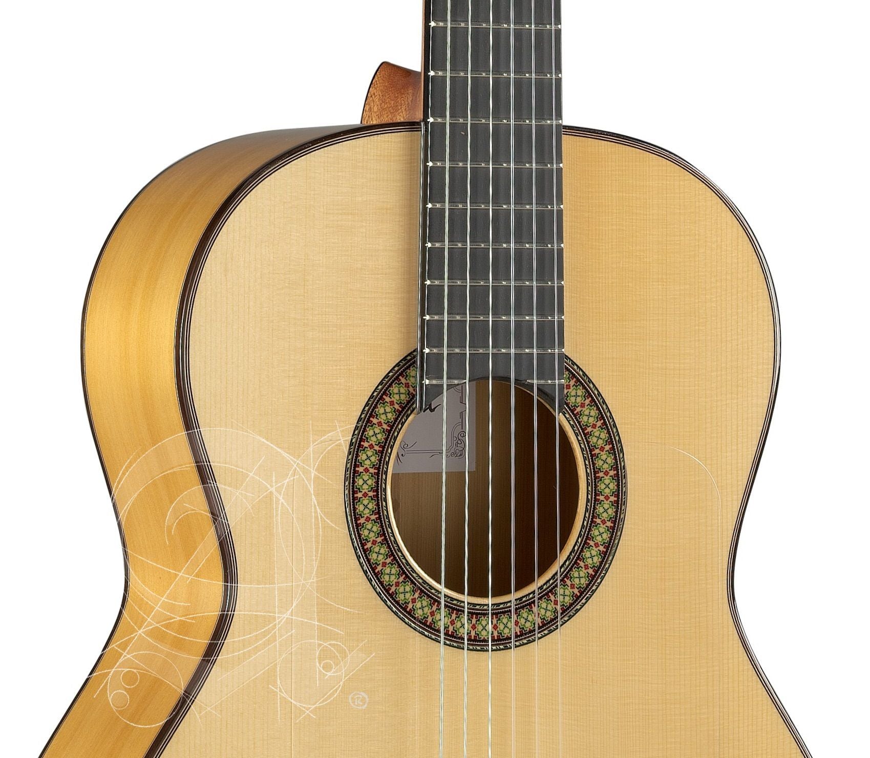 Besides the solid cypress back and sides and top solid spruce German, this guitar incorporates ebony on the fingerboard, gold plated machine heads and ebony reinforcement on the neck.