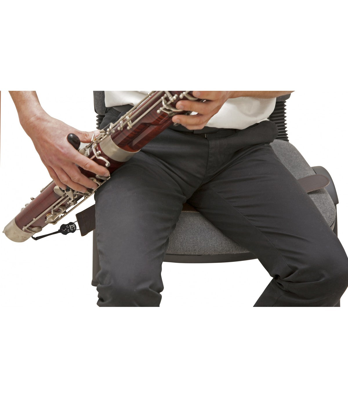 BG's bassoon leather seat strap lays flat across your chair seat and attaches to your bassoon boot cap by way of a metal hook.