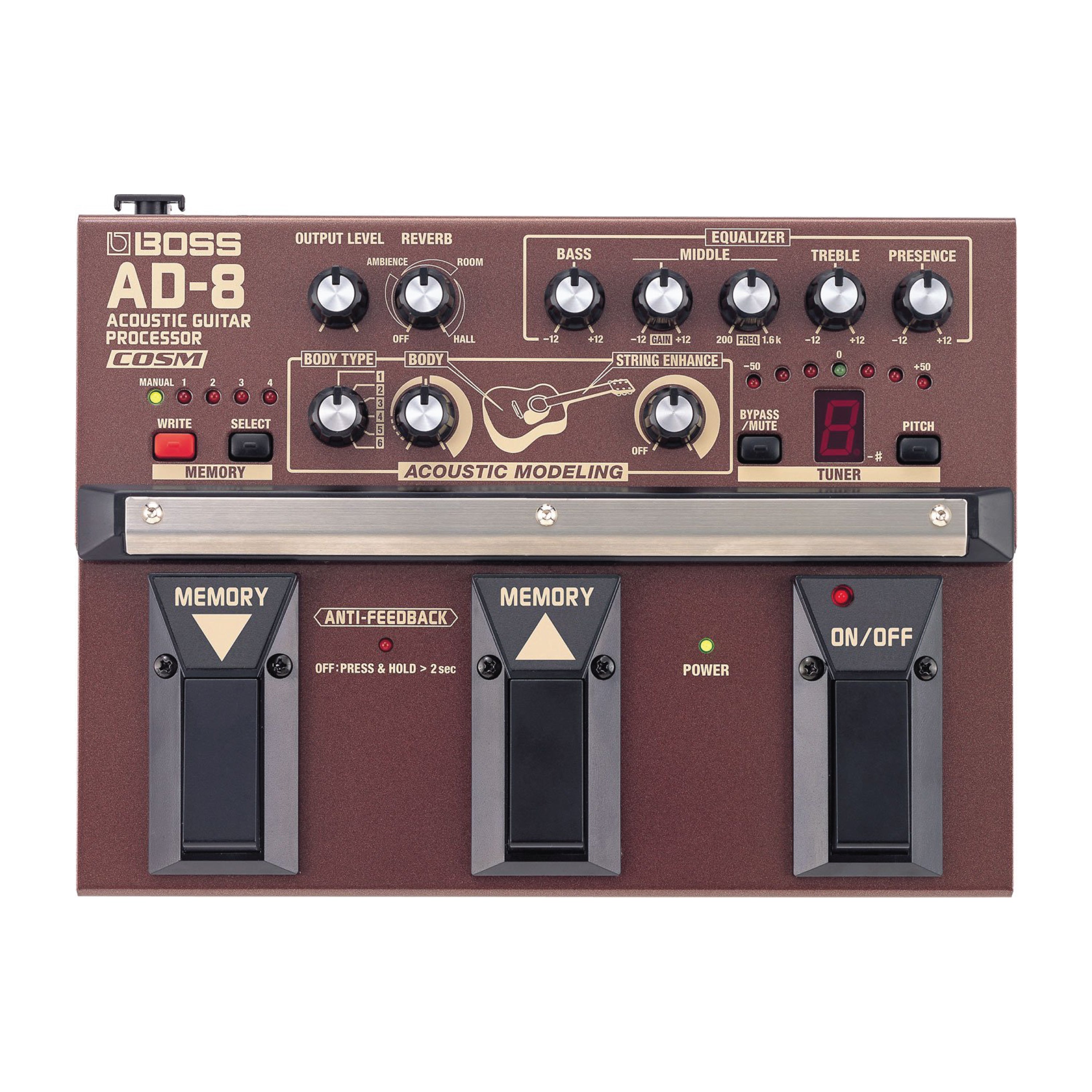 The BOSS AD-8 Acoustic Guitar Processor uses COSM modeling technology to transform the piezo pickup sound of an ordinary acoustic into six high-end acoustic guitars. The versatile AD-8 can also simulate the warm sound created by miking the guitar's neck and body -a world's first!