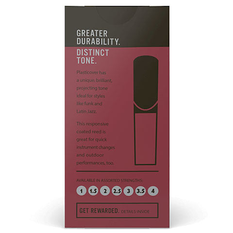 Plasticover features a brilliant, projecting tone that gives voice to many music styles. Favored by rock & pop performers, Latin jazz artists, and within all corners of jazz, this coated cane reed is ideal for quick instrument changes and enduring extreme weather conditions.
