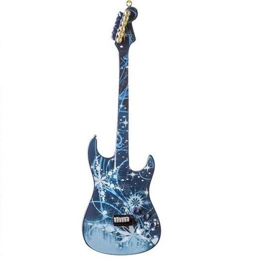 The body of this 5.5-inch resin Stratocaster guitar ornament boasts a charming winter wonderland scene that brings holiday cheer to this traditional Fender body design. Among the ornament’s other appointments are gold tuning machines and blue tone knobs for an added decorative touch.
