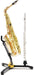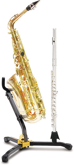 The HERCULES Saxophone and Flute/Clarinet Stand DS532BB features a folding yoke, an adjustable backrest, and locking pins that all safely and securely hold a Tenor or Alto Saxophone; includes an additional peg for either a Flute or Clarinet.