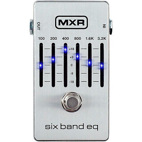 The MXR Six Band EQ covers all the essential guitar frequencies and has been upgraded with noise-reduction circuitry, true bypass switching, brighter LEDs for increased visibility, and a lightweight aluminum housing. Specifications - Input Impedance: 470 kΩ - Output Impedance: 5 kΩ - Max Input Level (All Sliders at 0 dB): +14 dBV at 1 kHz - Max Output Level (All Sliders at 0 dB): +14 dBV at 1 kHz - Frequency Response: ±1 dB,20 Hz to 20 kHz - Noise Floor: -101.7dBv - Filtering ±18db at: 100,200, 400, 800, 1.6K, 3.2K: ±18dB shelf at 16kHz