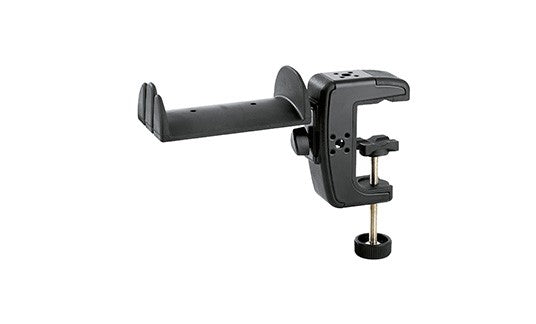 he new headphone holder including an innovative table clamp is a guaranteed secure and comfortable holder for your headphones. The holder protected with soft rubber can easily hold 2 standard headphone sets and 2 in-ear headphones can additionally be hung on the front. The headphone holder can be fixed in four different directions using the clamping screw. In addition the holder can be rotated from any position by 90°. The clamp can be extended from 0 to 48 mm allowing it to be mounted on a wide variety of tables. The stable metal construction with high quality plastic inserts guarantees a secure and strong attachment. The cleverly shaped clamping parts allow the clamp to be used on smooth surfaces and round-shaped tubes.
