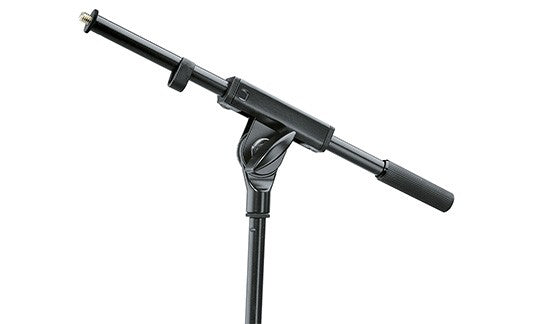 Short one-piece boom arm with 3/8" thread. Locking washer and plastic grip. Smooth adjustment. Easy to tighten with wing nut.