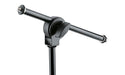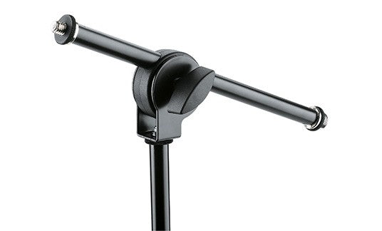The short moveable microphone boom arm is suitable for many applications. It is particularly appropriate for overhead uses. There are 3/8" and 5/8" threaded connectors to take the microphone holder. Thanks to the flexible clamping, the boom arm can be positioned in length and angle with one simple movement.
