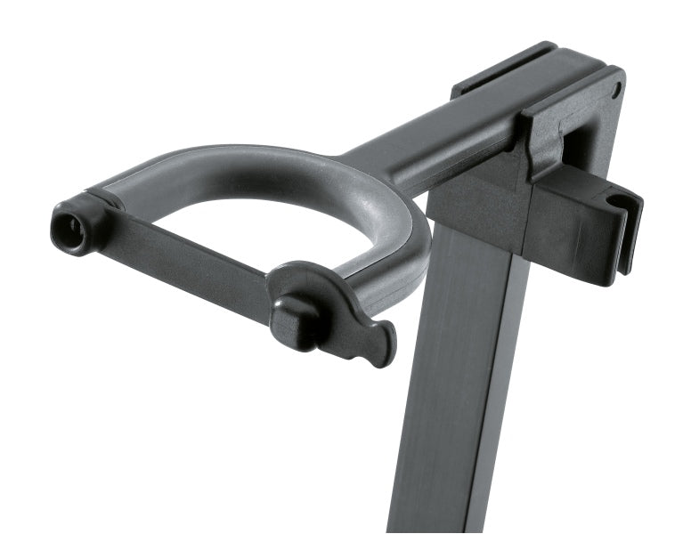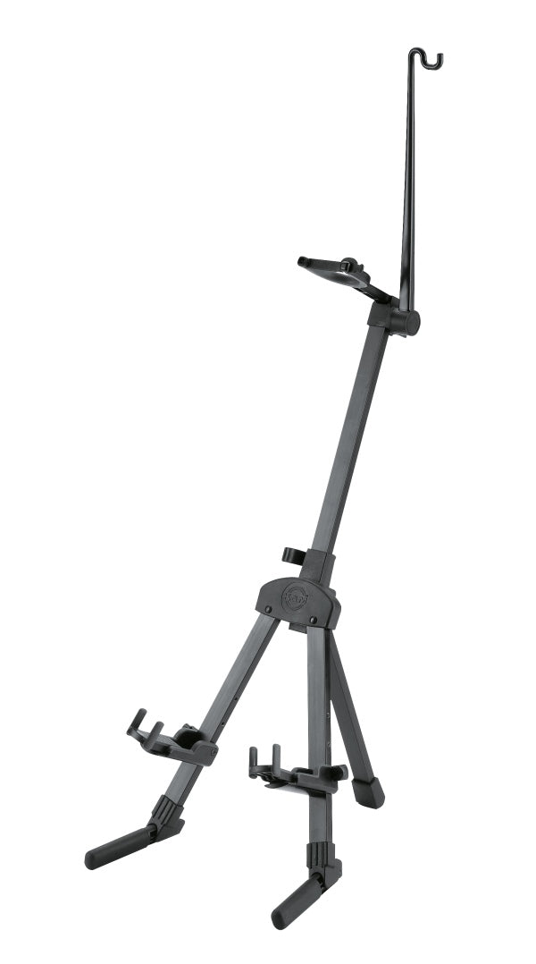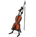 Compact, stable aluminum violin stand. Fully height adjustable instrument support arms can be adjusted to fit a variety of violin sizes. The instrument support arms are lined with soft plastic material to protect the instrument finish. Height adjustment using a non-slip clamping lever. The solid yoke has a safety lock to provide extra protection. Integrated bow holder.