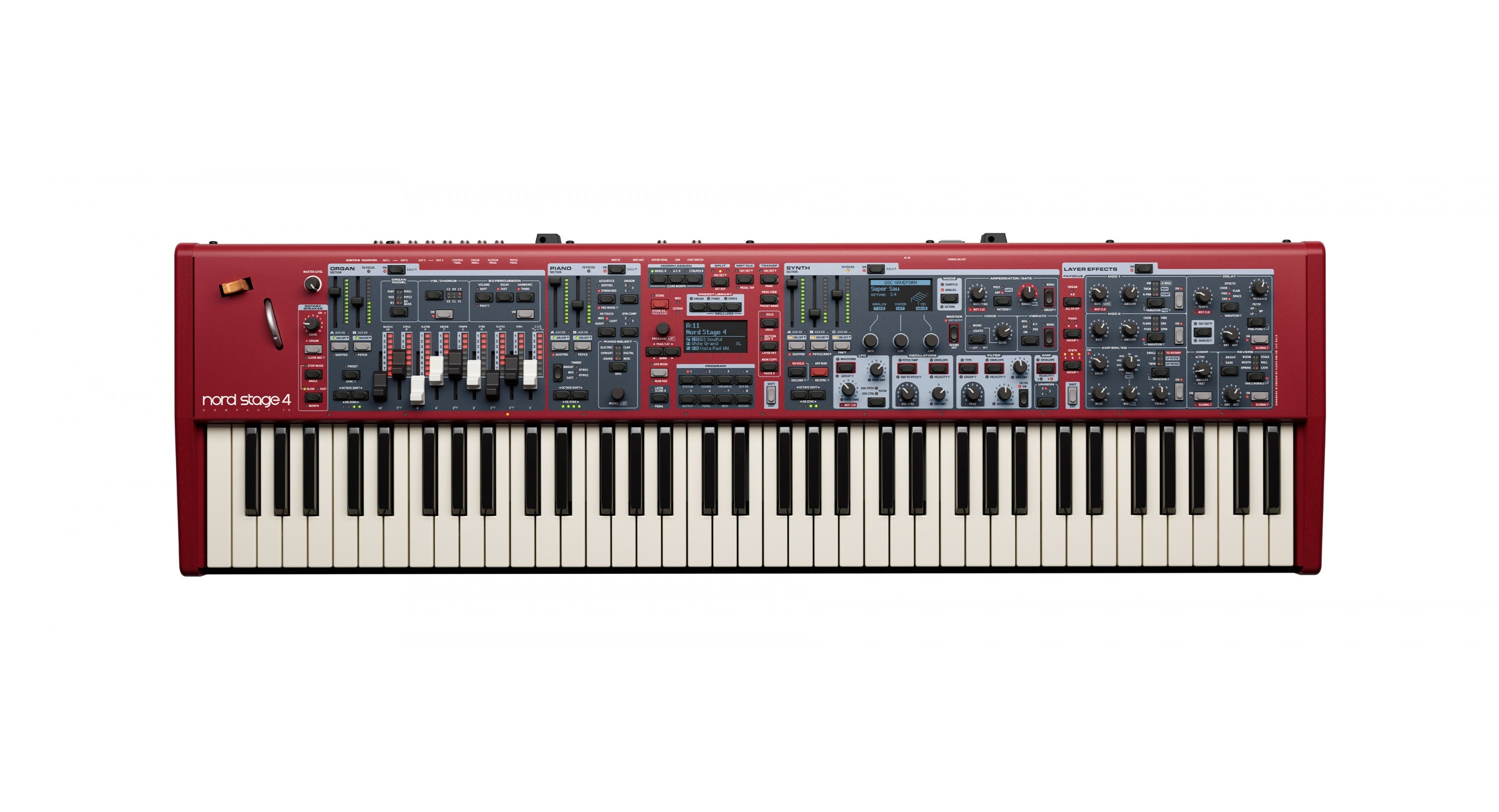 - Nord Stage 4 Compact with a 73-note Semi Weighted Waterfall Triple Sensor keybed (E-E) with aftertouch and Physical Drawbars with LED indicators