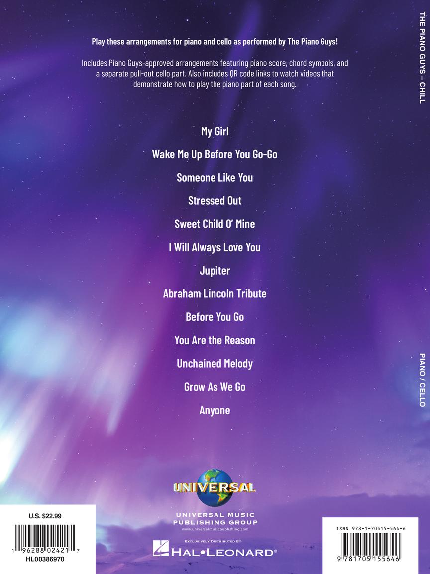 The Piano Guys say of their 2021 album Chill, “We hope this album is the kind of music your mind needs–familiar melodies couched in a context musically engineered to help your mind CHILL, crowd out the clutter, and instead hold onto the good things. To be powerful. It doesn't take peaks in volume and fast paced motion running every which way at once. Power can come from simply being still. Being CHILL.” Our matching folio presents all 13 tracks in artist-approved piano/cello arrangements that match the recordings with a separate pull-out cello part.