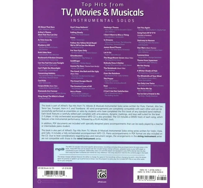 This series offers a versatile selection of music for flute, clarinet, alto sax, tenor sax, trumpet, horn in F, trombone, violin, viola, and cello. Each book contains carefully edited arrangements appropriate to each instrument, and is well suited for level 2-3 students. The online media includes a fully orchestrated demo track of each song, which features a live instrumental solo performance, followed by a play-along track. Also included are PDFs of piano accompaniments, and Alfred's Tempo Changer Software.